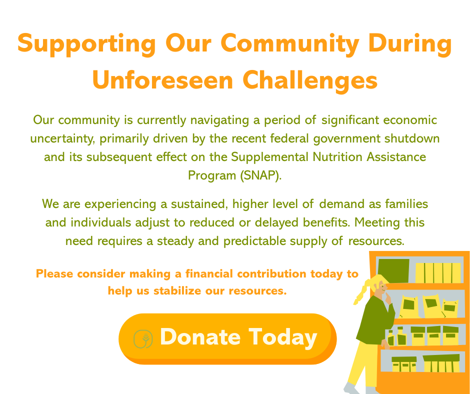 The Food Bank welcomes donations of all perishable and non-perishable, unopened food. Donations can be dropped off at our warehouse store.