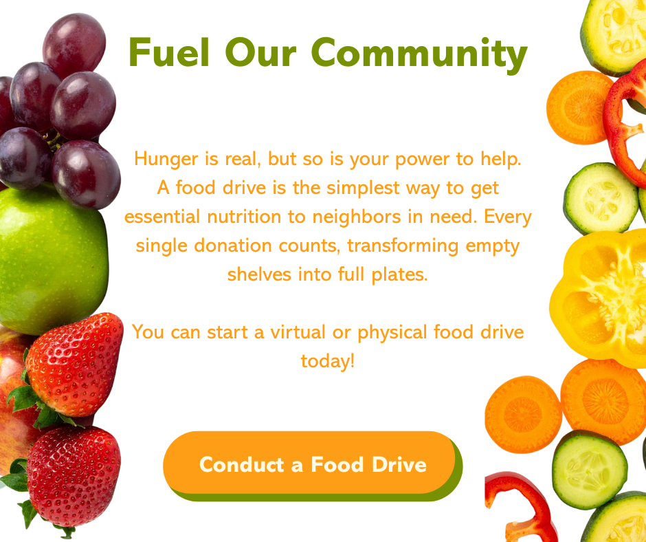 The Food Bank welcomes donations of all perishable and non-perishable, unopened food. Donations can be dropped off at our warehouse store.